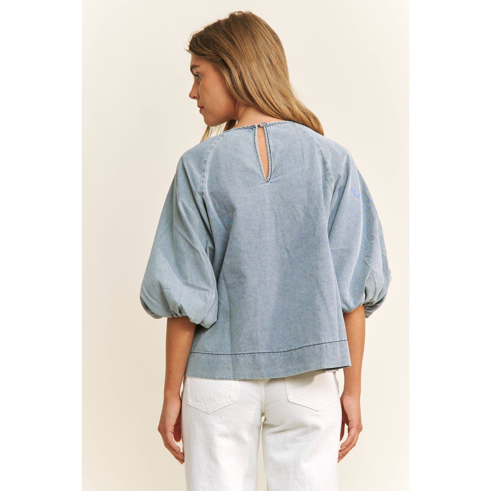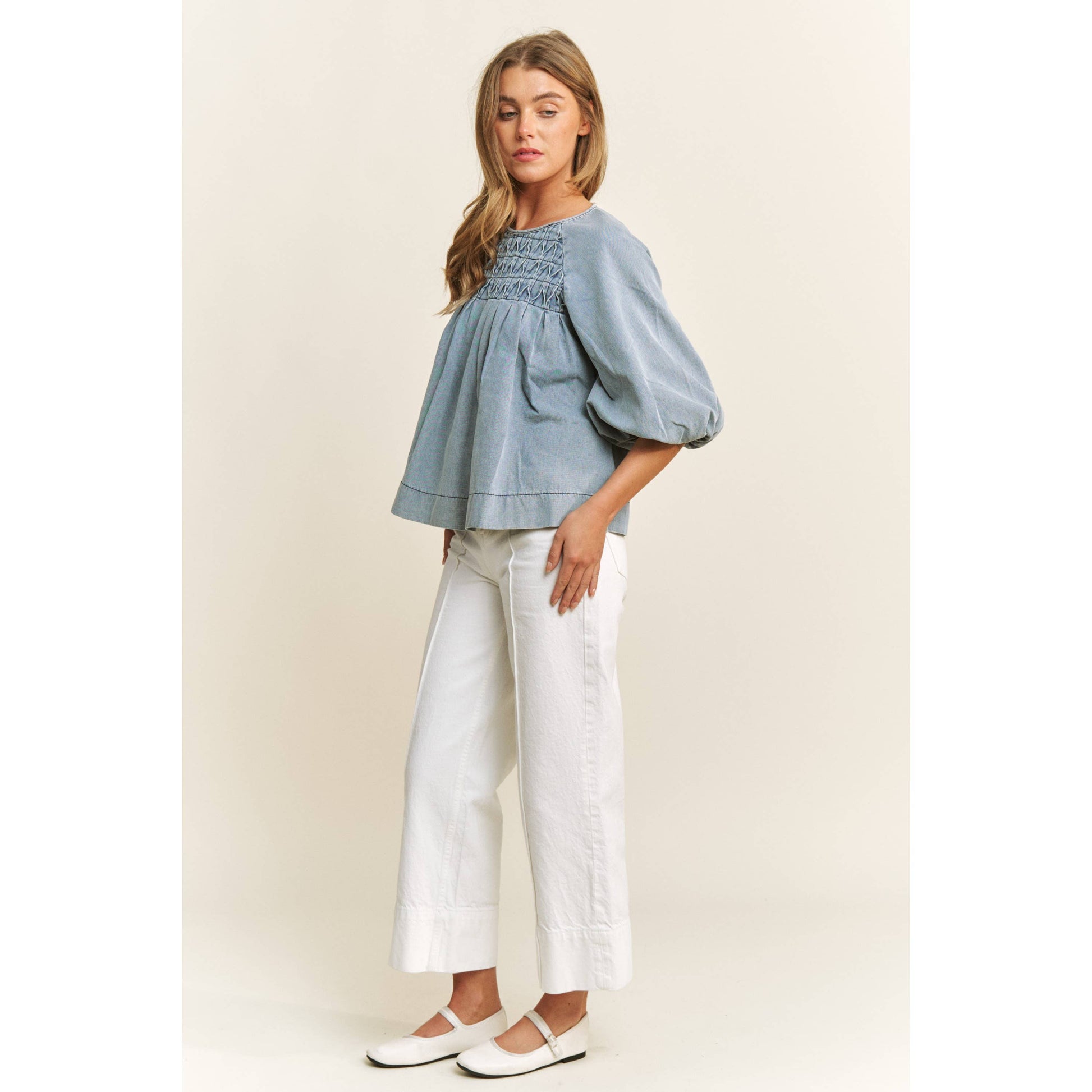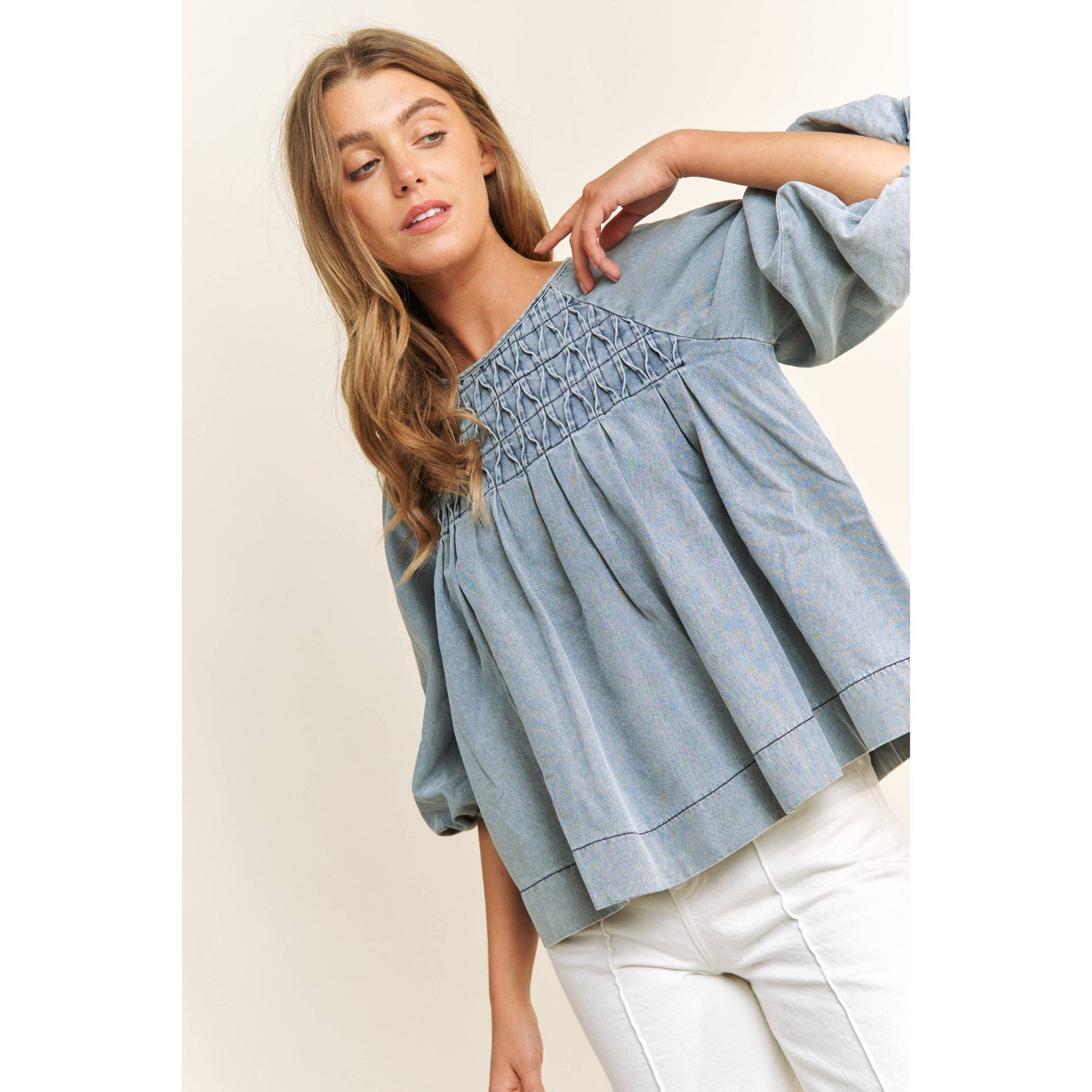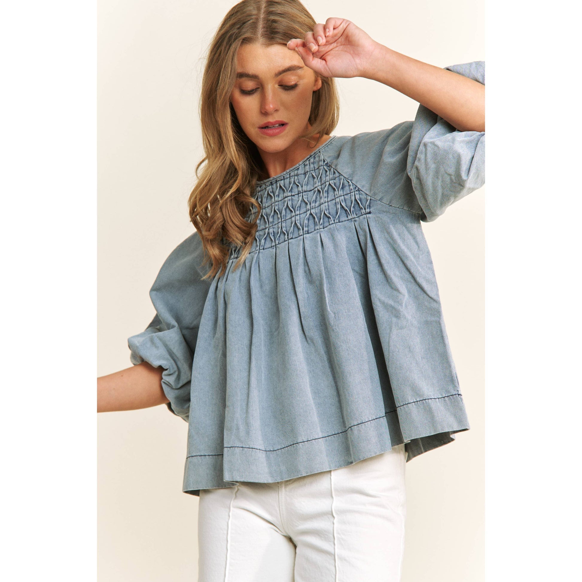 This babydoll top with puff sleeves is a timeless boutique staple with charming detail. Designed with special stitched accents on the front, a classic relaxed fit, and half-length sleeves, it offers effortless comfort and flattering style. Finished with loop and button closures at the center back neckline, this versatile top pairs perfectly with jeans, shorts, or skirts for an easy everyday look.